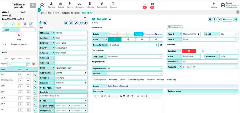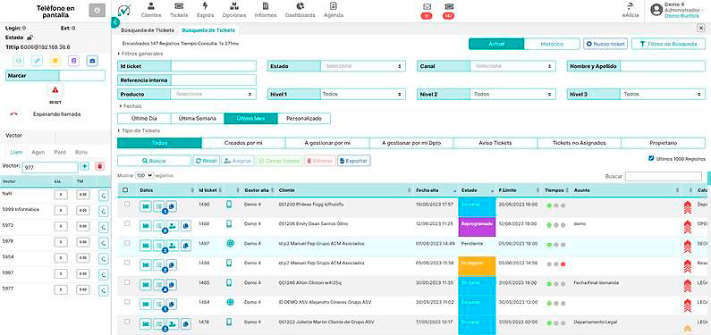 Desde la pantalla, integrada en el margen izquierdo de RunTick, podrás generar y recibir llamadas, dejar en espera o bien grabar las llamadas, además de gestionar vectores, equipos de agentes y buzones.